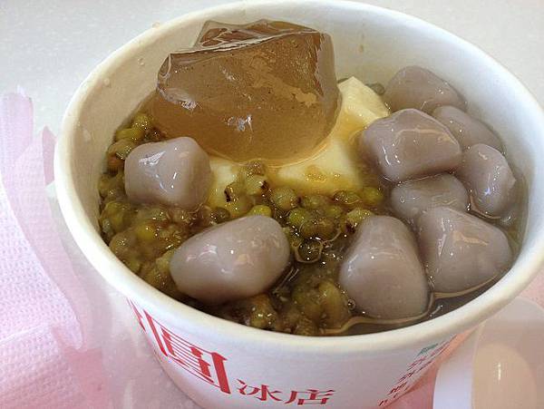 豆花+綠豆+芋圓+愛玉(老闆愛玉小了點哦 XDD)